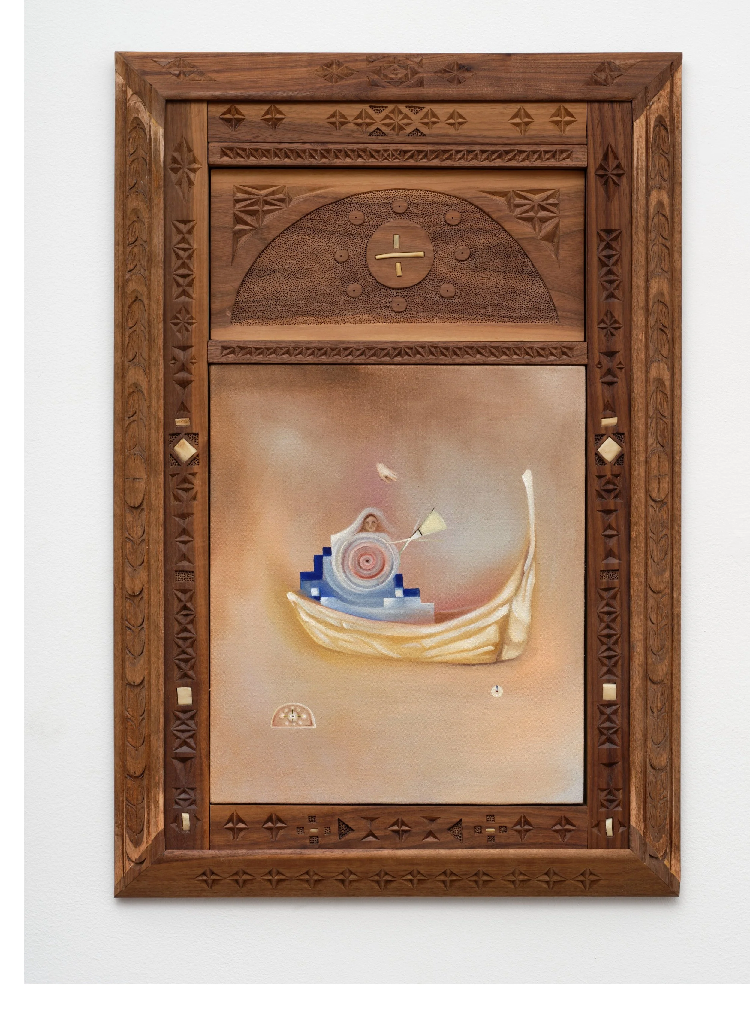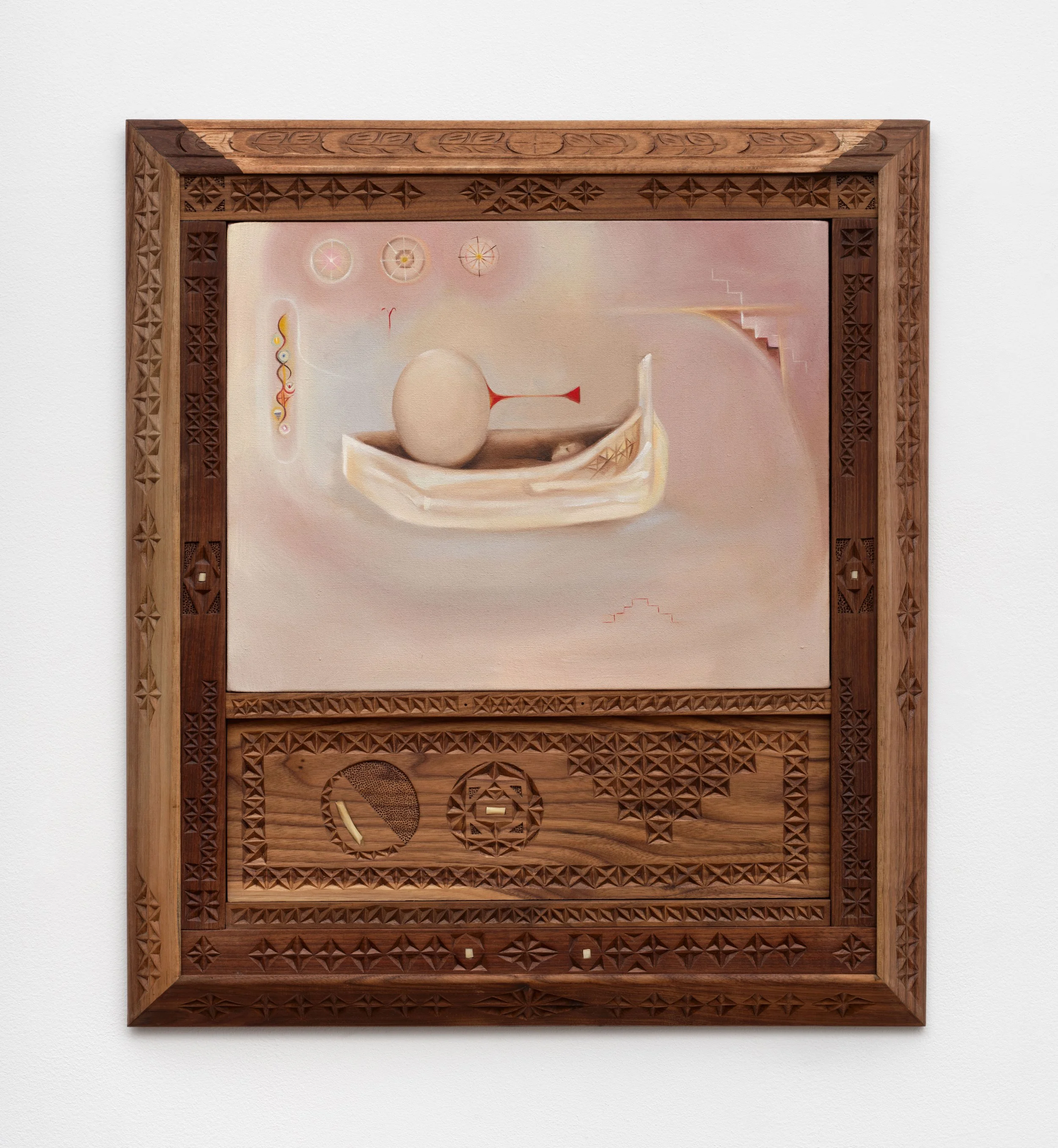 In the final exhibition of Box (a proposition for ten years) in 2024, a model of a ship made of bones sits atop its founding compartment. Paintings of the “bone ship” reappear throughout the gallery. In the paintings, a bone ship is surrounded by stairs, a ladder, and a cup. Oil paintings are held together by intricately hand-carved walnut frames with an x-pattern, made by Fernández and her late grandfather, Jose Luis Carcedo. Shaped bone is inlay into the walnut. The number three (represented by hands) appears in multiple forms, representing past, present, and future (or birth, life, and death).