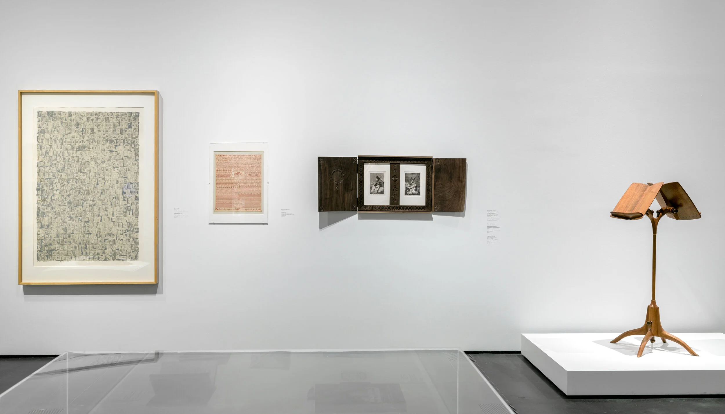 Produced as a commission for the Los Angeles County Museum of Art, Fernández pairs a selection of Goya’s etchings from the Caprichos series with reproductions of her grandfather’s carvings and framing devices. The exhibition Not I: Throwing Voices addresses questions of authorship and objecthood. Who speaks for whom? How is the voice split into and between many bodies? How is gesture passed down? A grouping of sculptural forms—a podium, a book, and a black board—signifiers of a classroom setting, are reconstructed by the artist and decorated with her grandfather’s stylistic carving style to speak of intergenerational relationships and the transmission of knowledge. Motifs from Goya’s etchings are translated into carvings and inserted alongside some of her grandfather’s unfinished fragments, remnants of past work. Through the copy of a mark and a collapsing of time, Fernández proposes a personal canon of Spanish art history.