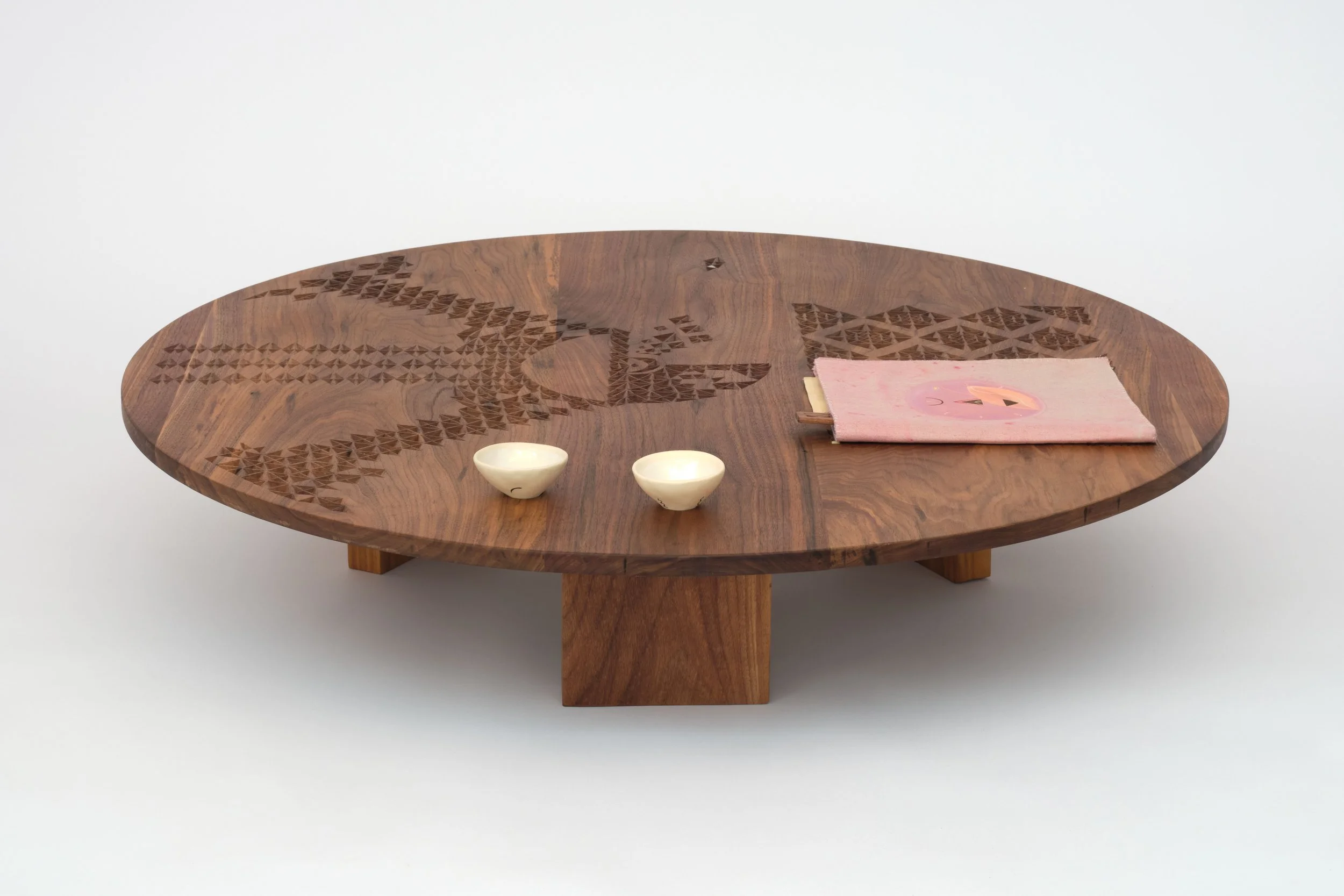 Fernández draws on such matriarchal wisdom to imagine a space for human connection and exchange. The title of the show comes from a love poem by the late queer feminist poet Adrienne Rich, whose own magnanimous act in 1974 of receiving the National Book Award with Alice Walker and Audre Lorde, begot future courageous acts of sharing and rejecting winner-take-all ideology. A circular walnut table sculpture features repeated X shaped carvings that were a signature of her grandfather, who thought of them as stars. For Fernández, it long symbolized a timekeeping unit, as she observed how it took her grandfather five minutes to carve one X. The motif takes on a new layer of meaning, of the complementary in betweens. Two ceramic cups shaped like breasts rest on the table, inviting us to sit down, share a drink, and consider the cords of love and kindness that tie us.